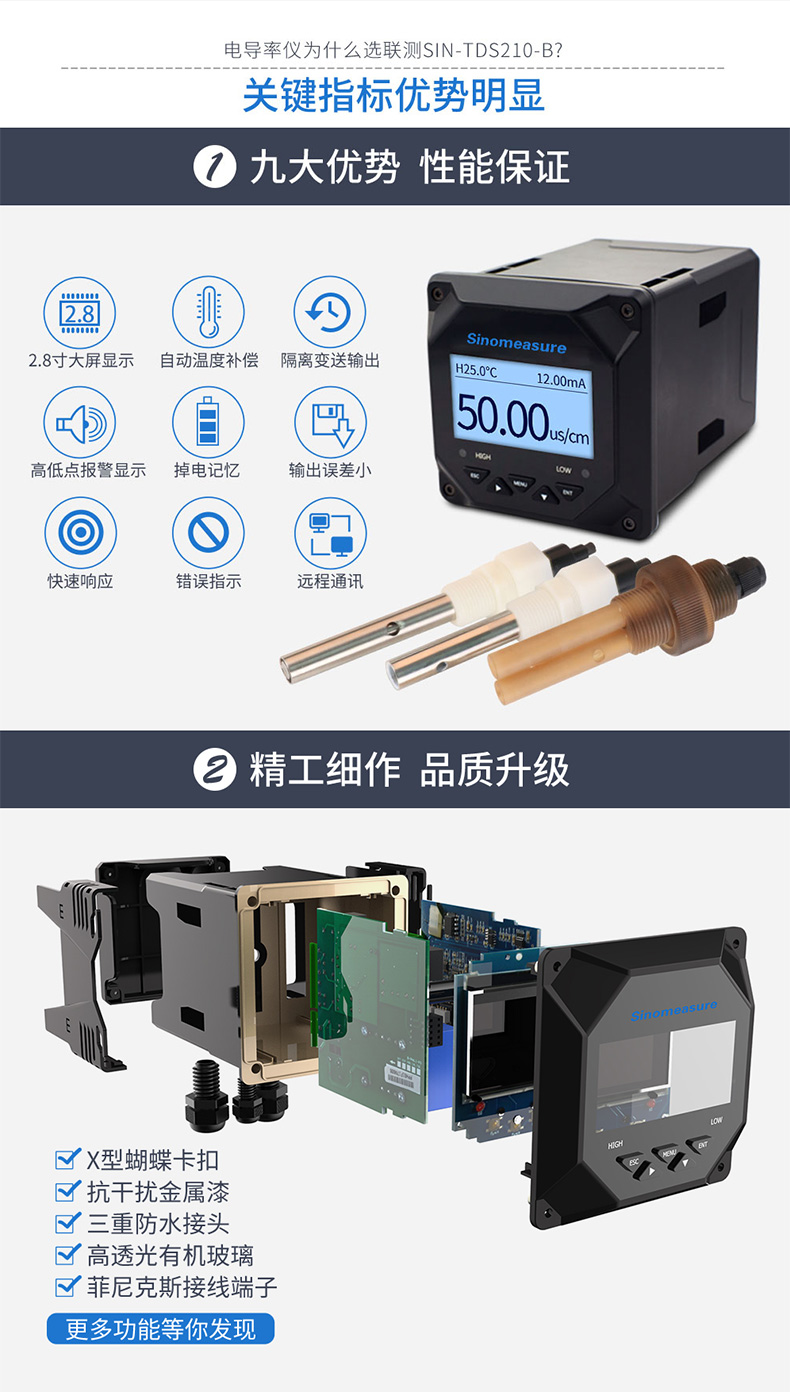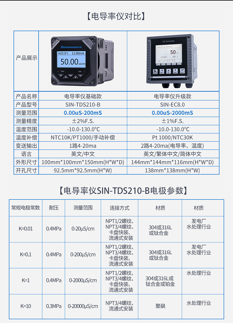 SIN-TDS210工業電導率儀表,可對各種工業用水的電導率(TDS)值進行連續測量和控制,本裝置廣泛應用于科學實驗裝備、化工、制藥、環保、冶金、造紙、食品、飲料及供水等行業。根據水工業的環境和特點結合國際供電標準,考慮了特殊環境的電氣設計規范,增加了220VAC供電。