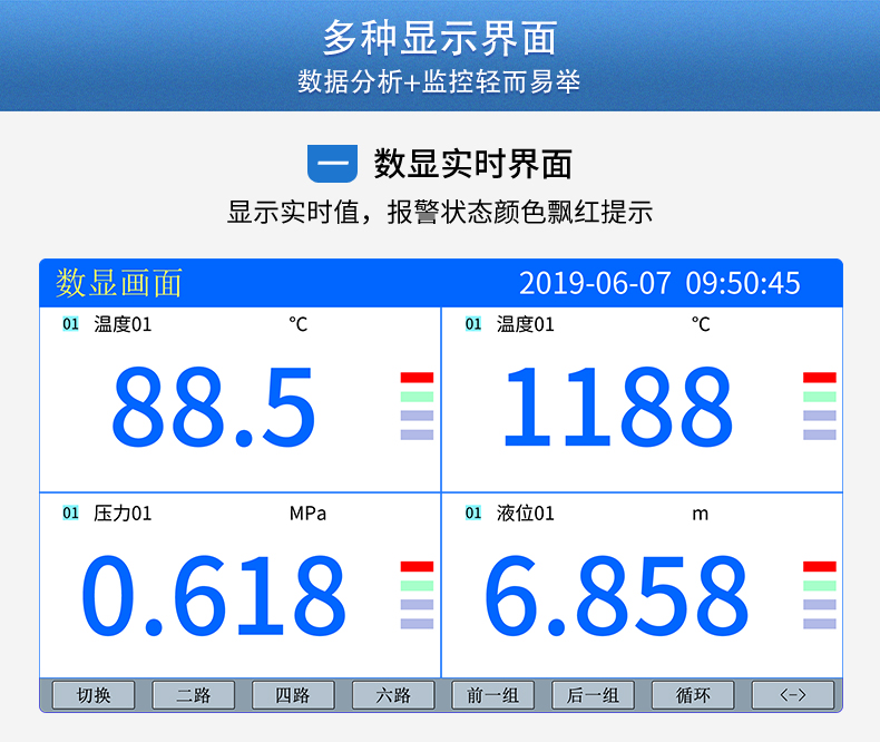 SIN-R5000C無紙記錄儀 12 路萬能輸入(可組態選擇輸入:標準電壓、標準電流、熱電偶、熱電阻、毫伏等)。可帶 12 路報警輸出或 6 路模擬量變送輸出,RS485 通訊接口,以太網接口,微型打印機接口和 USB 接口,SD 卡插座;可提供傳感器配電;具有強大的顯示功能,實時曲線顯示,歷史曲線追憶,棒圖顯示,報警列表顯示等。人性化的外觀設計、完美的功能體現、可靠的硬件品質、精湛的制造工藝,使儀表具有更高的性能價格比。